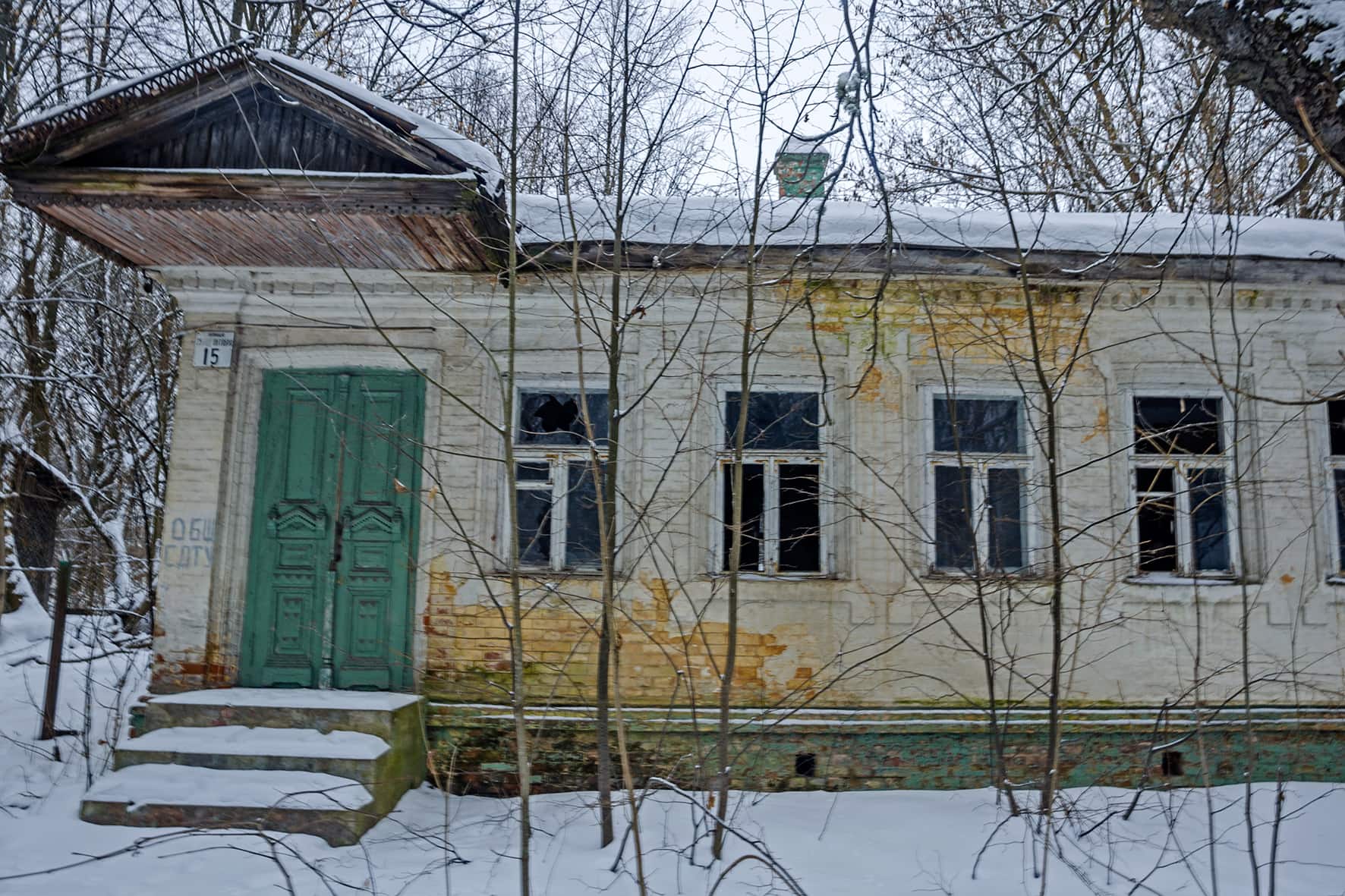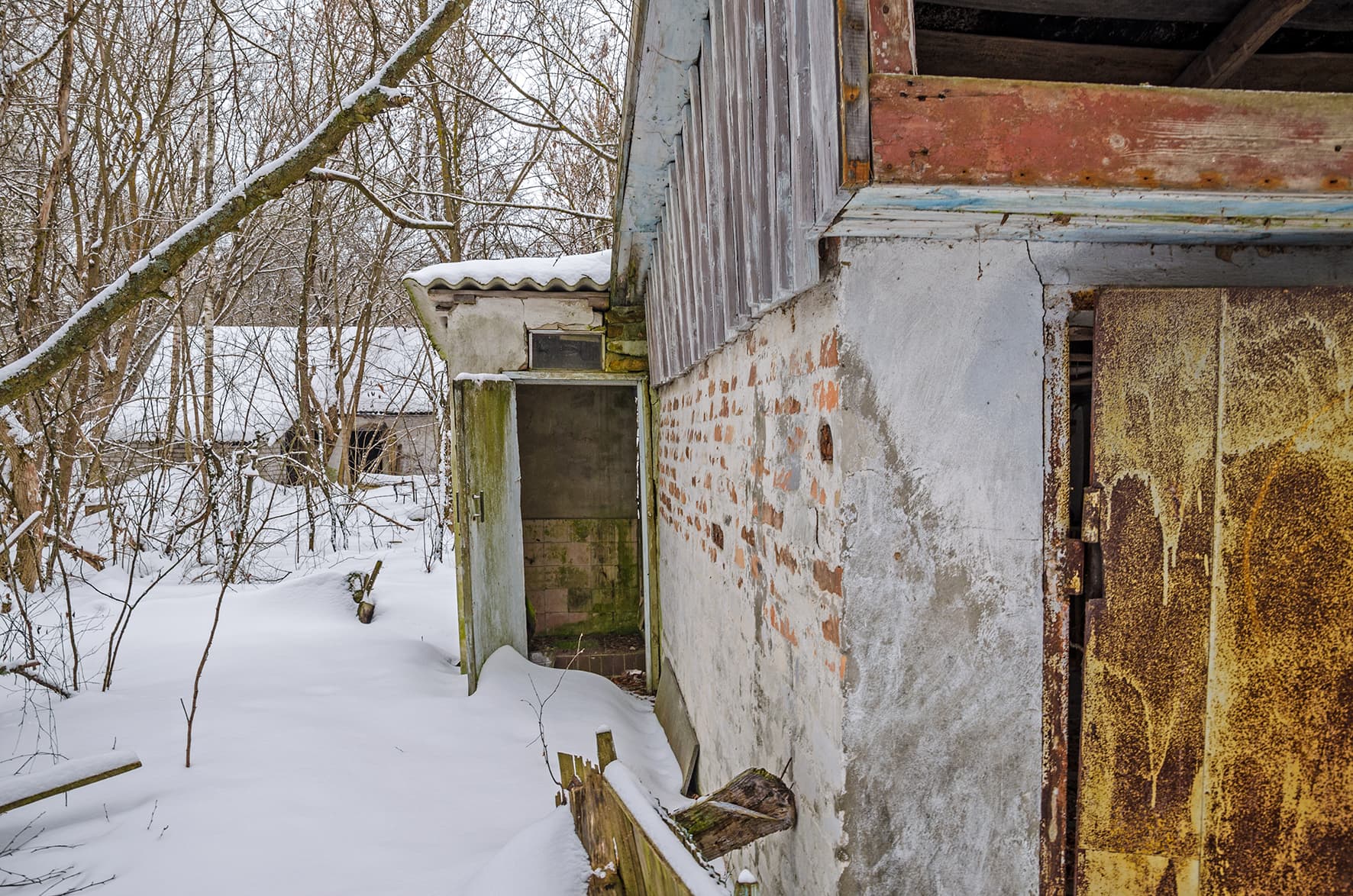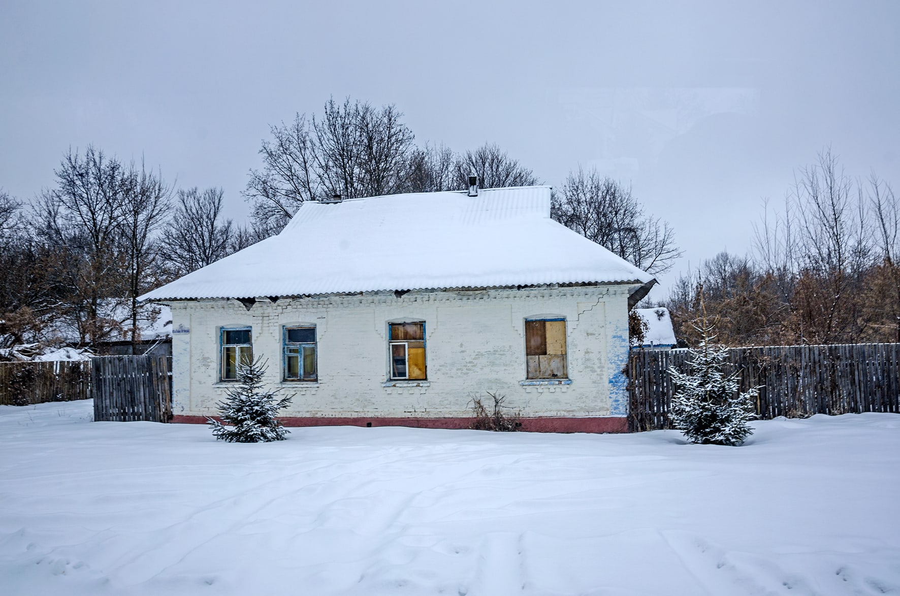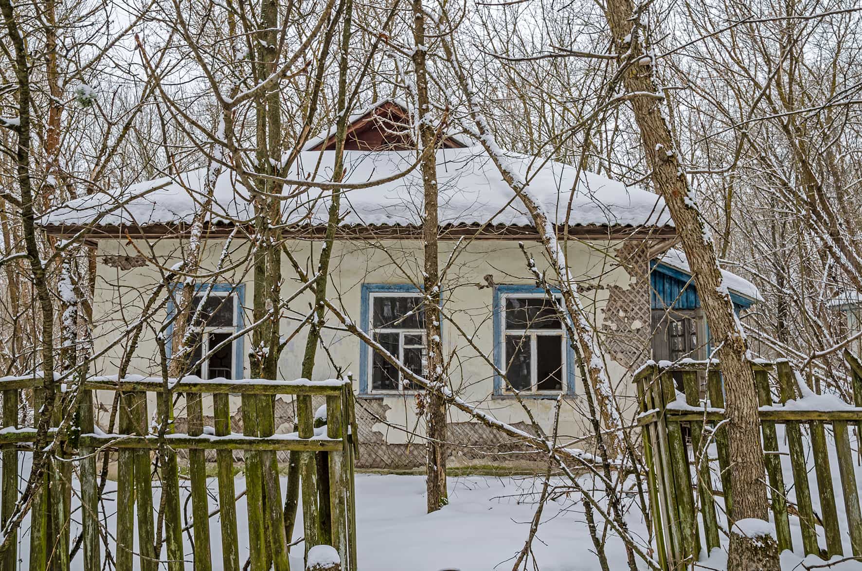 W śniegu po kostki jest wydreptana ścieżka, wzdłuż drzew, która prowadzi nas do furtki. Furtki już dawno nie ma a płot chyli się ku upadkowi. Wszystkie domostwa wyglądają tak samo. Powybijane okna, spróchniałe podłogi, łuszcząca się farba na ścianach, porozrzucane rzeczy, papiery. Gdzieniegdzie, jakby nigdy nic stoi na stole kubek, pusta paczka papierosów, czy zawieszone na wieszakach rzeczy, czekają na właścicieli.