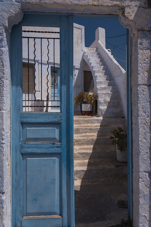 Obecnie Pyrgos zachwyca biało niebieską architekturą. Spacerując w górę, wąskimi, brukowanymi uliczkami, zaglądamy do mijanych domostw. Co mnie bardzo dziwi, nie spotkaliśmy żadnego kota.