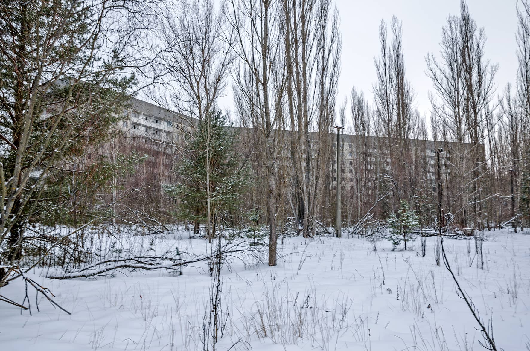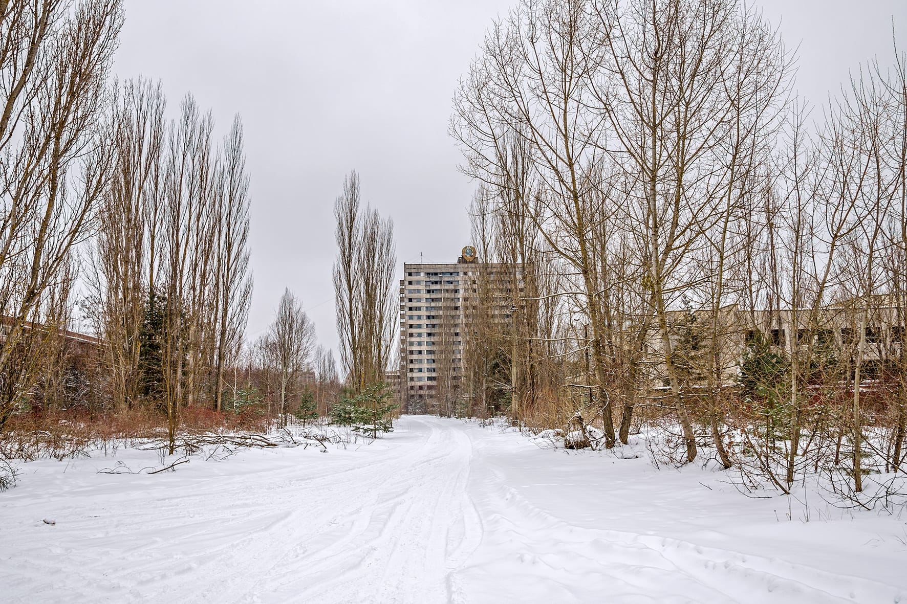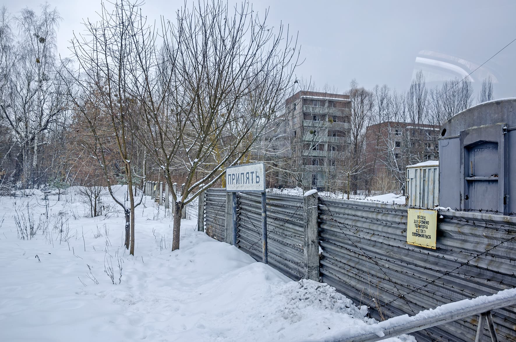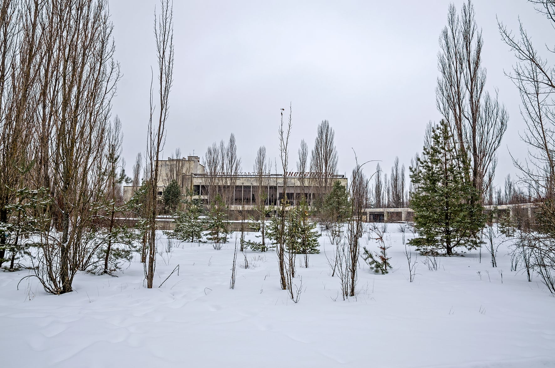 Podjeżdżamy pod wartownię. Pracownik sprawdza papiery i podnosi szlaban. Wjeżdżamy do miasta widma lub miasta duchów, jak je nazywają. W śniegu po kostki drogę wyznaczają ślady opon. Wjeżdżamy na główny plac Prypeci a później kilkanaście minut jeździmy po ‘ulicach’ miasta. To już nie miasto, to natura zaadoptowała ten teren. Tak jakby betonowe bloki wkomponowano w las. Raz po raz, Przewodnik opowiada nam, co mijamy.