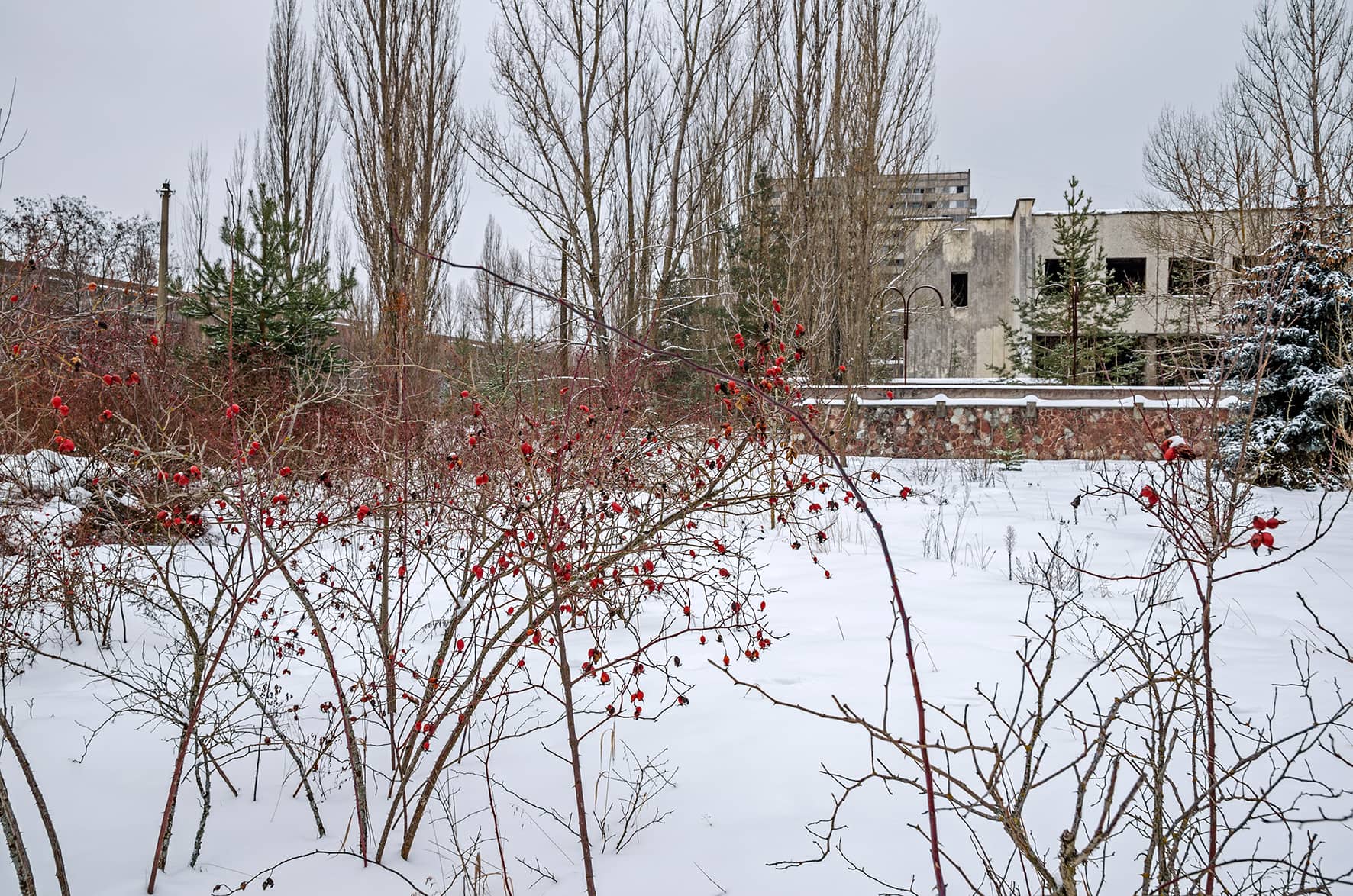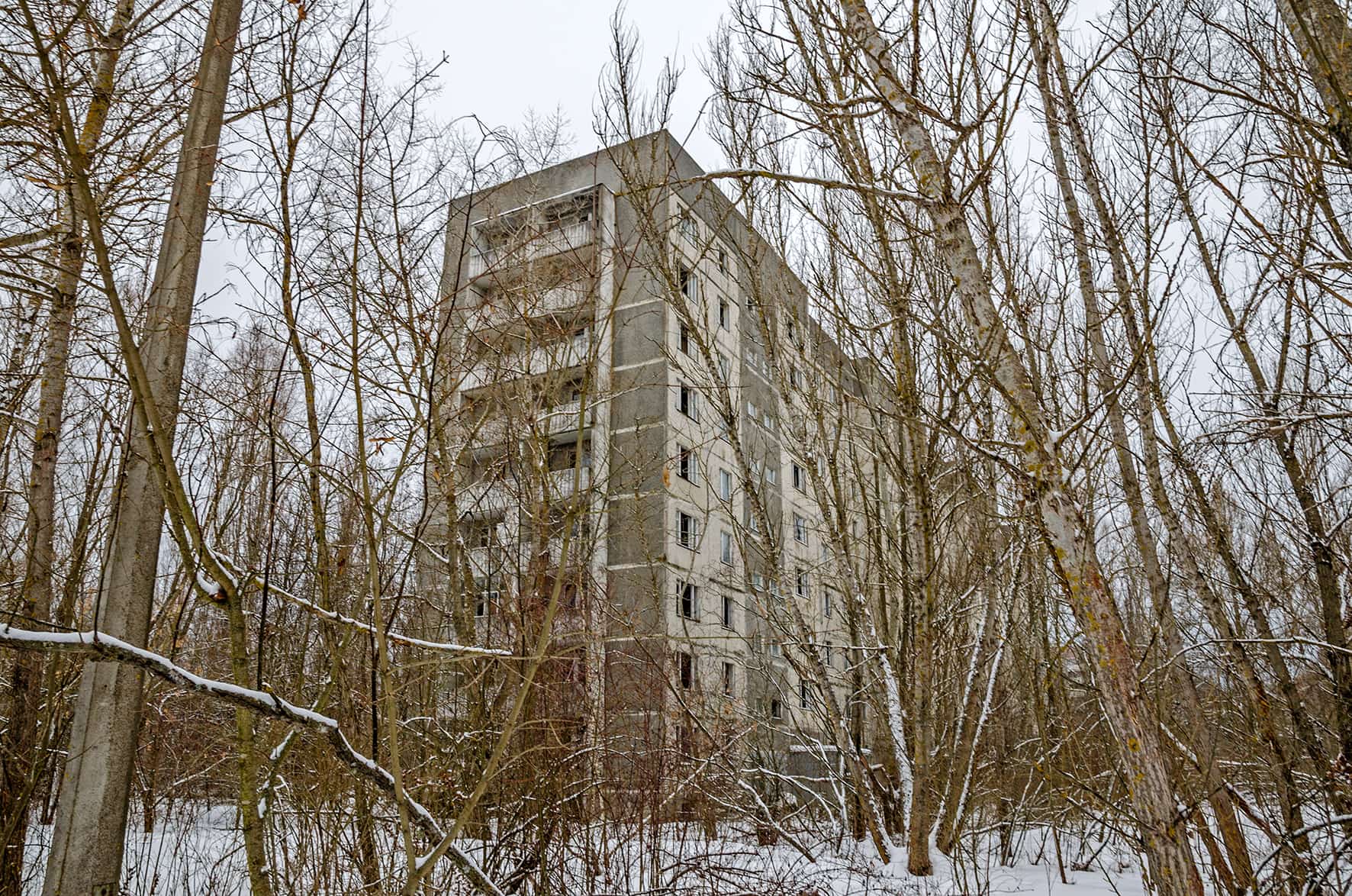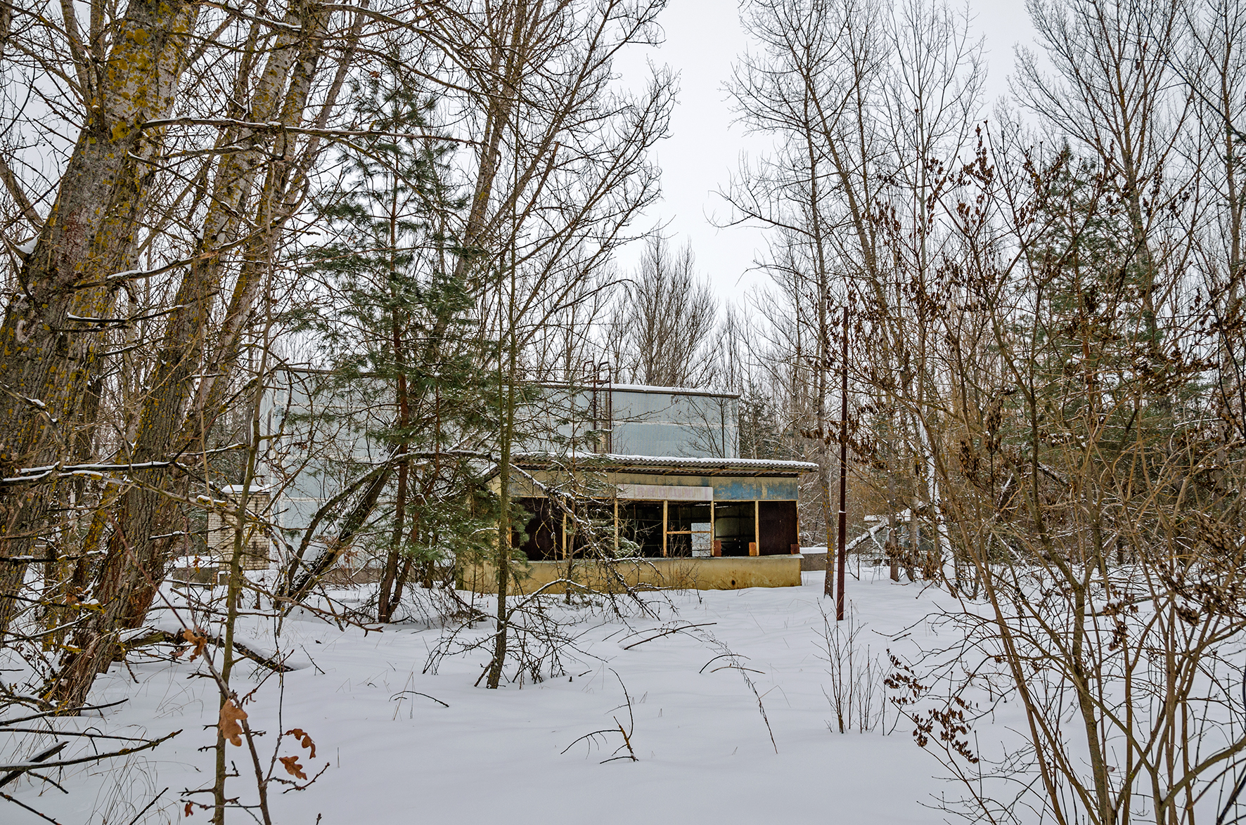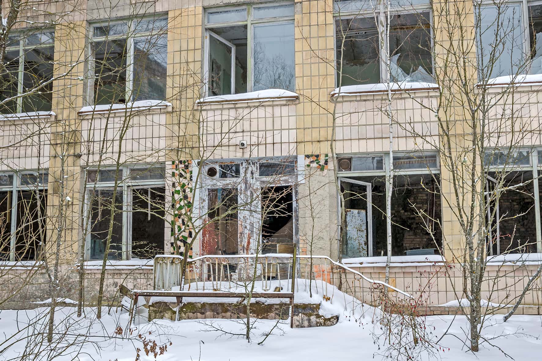 Podjeżdżamy pod wartownię. Pracownik sprawdza papiery i podnosi szlaban. Wjeżdżamy do miasta widma lub miasta duchów, jak je nazywają. W śniegu po kostki drogę wyznaczają ślady opon. Wjeżdżamy na główny plac Prypeci a później kilkanaście minut jeździmy po ‘ulicach’ miasta. To już nie miasto, to natura zaadoptowała ten teren. Tak jakby betonowe bloki wkomponowano w las. Raz po raz, Przewodnik opowiada nam, co mijamy.