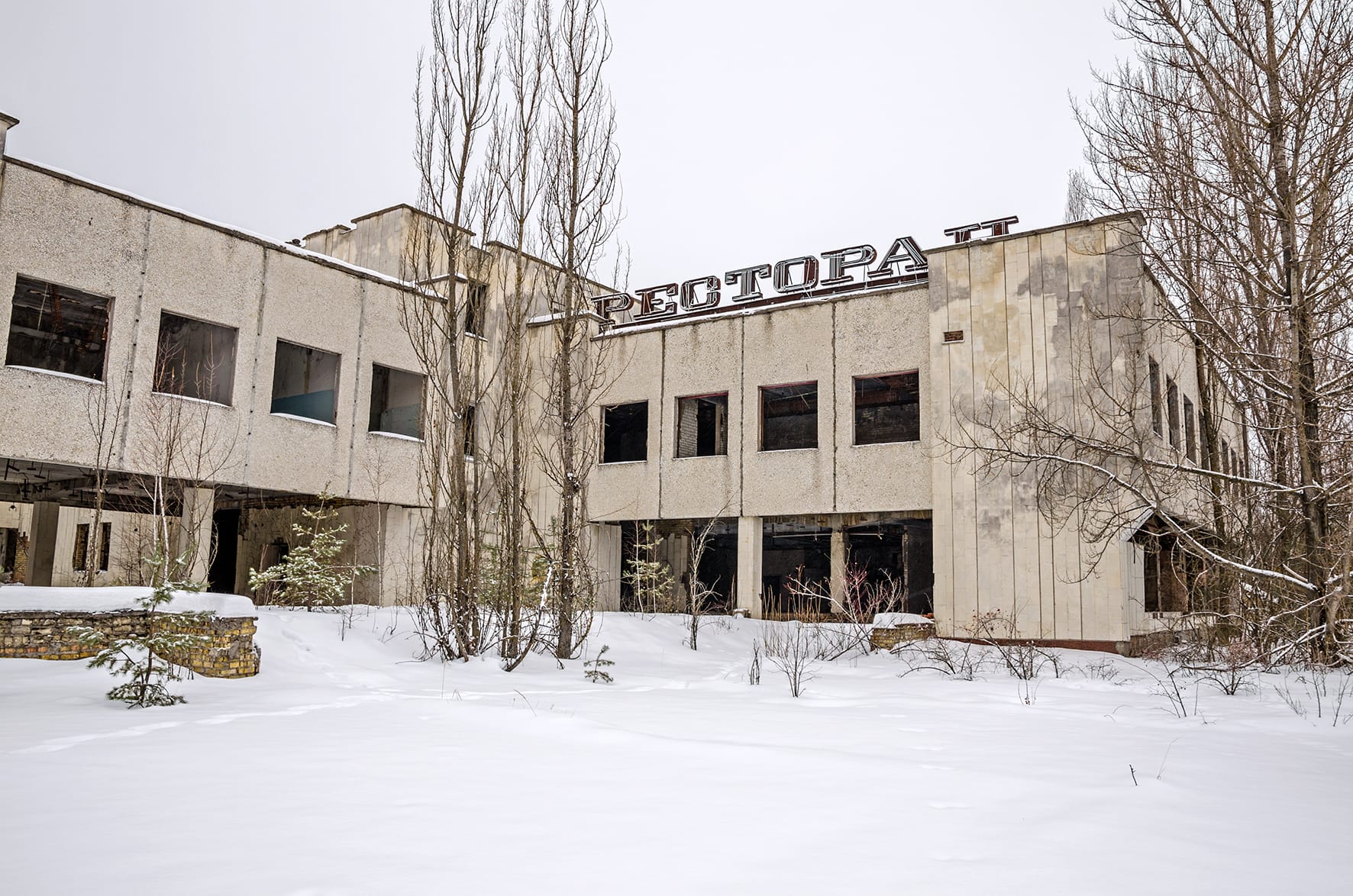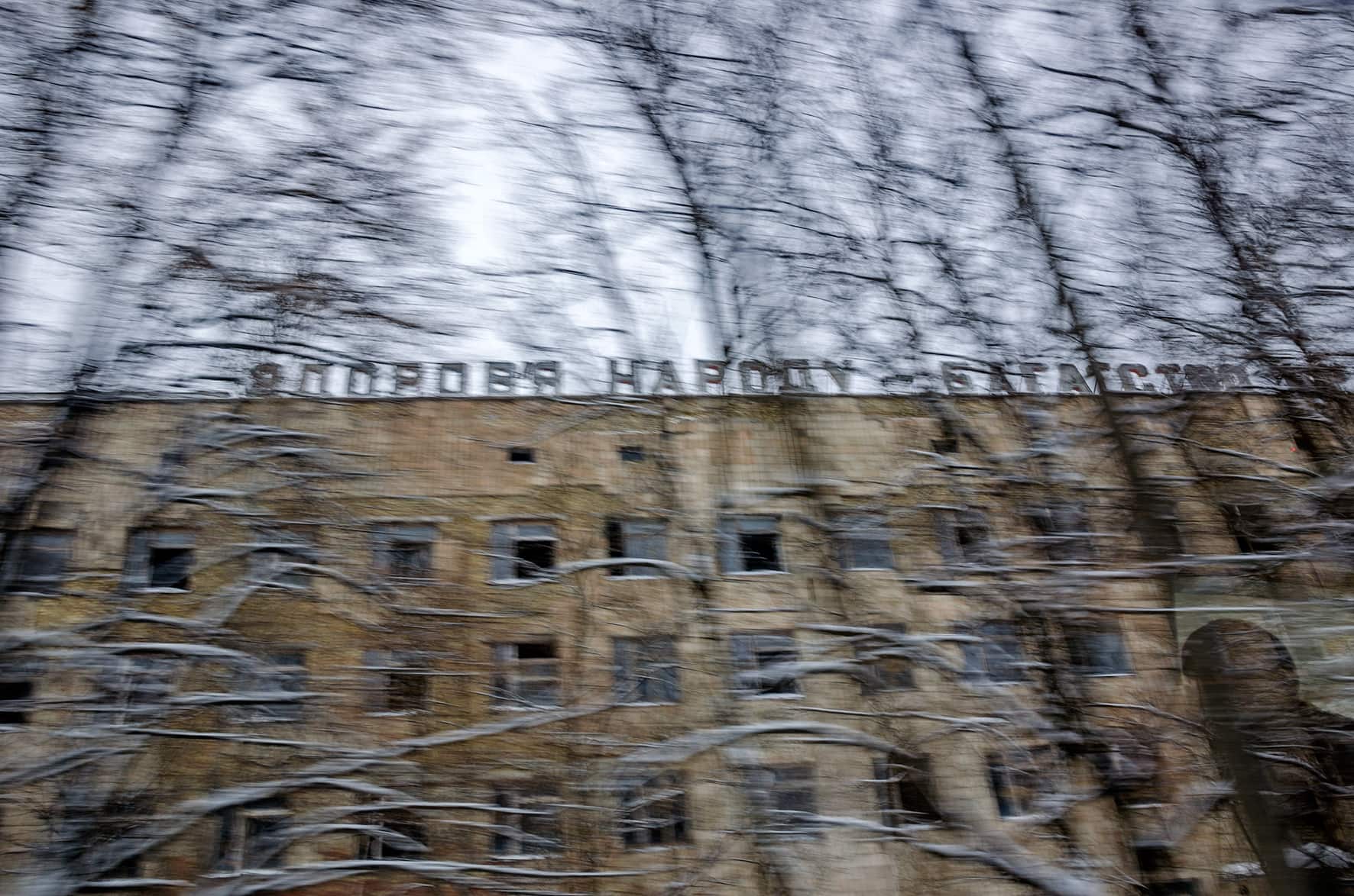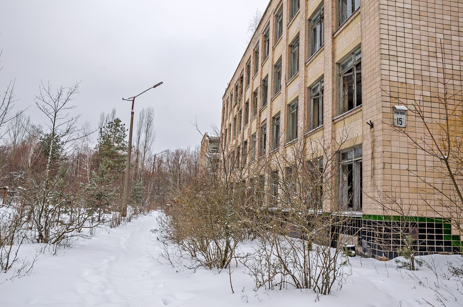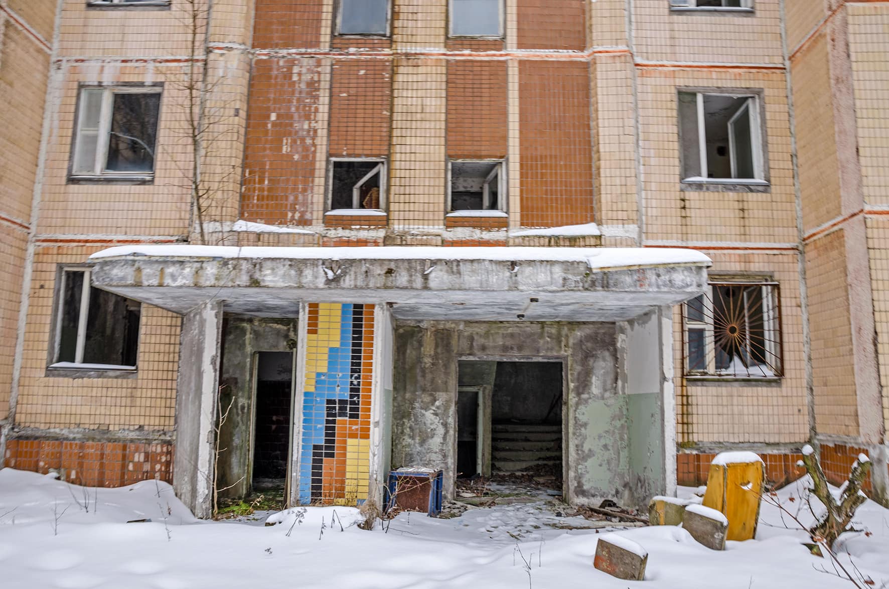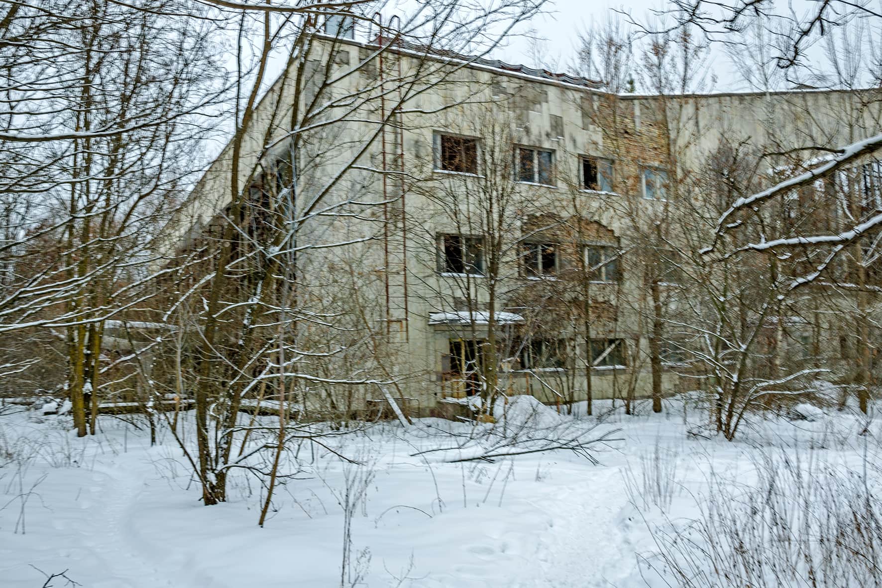 Podjeżdżamy pod wartownię. Pracownik sprawdza papiery i podnosi szlaban. Wjeżdżamy do miasta widma lub miasta duchów, jak je nazywają. W śniegu po kostki drogę wyznaczają ślady opon. Wjeżdżamy na główny plac Prypeci a później kilkanaście minut jeździmy po ‘ulicach’ miasta. To już nie miasto, to natura zaadoptowała ten teren. Tak jakby betonowe bloki wkomponowano w las. Raz po raz, Przewodnik opowiada nam, co mijamy.
