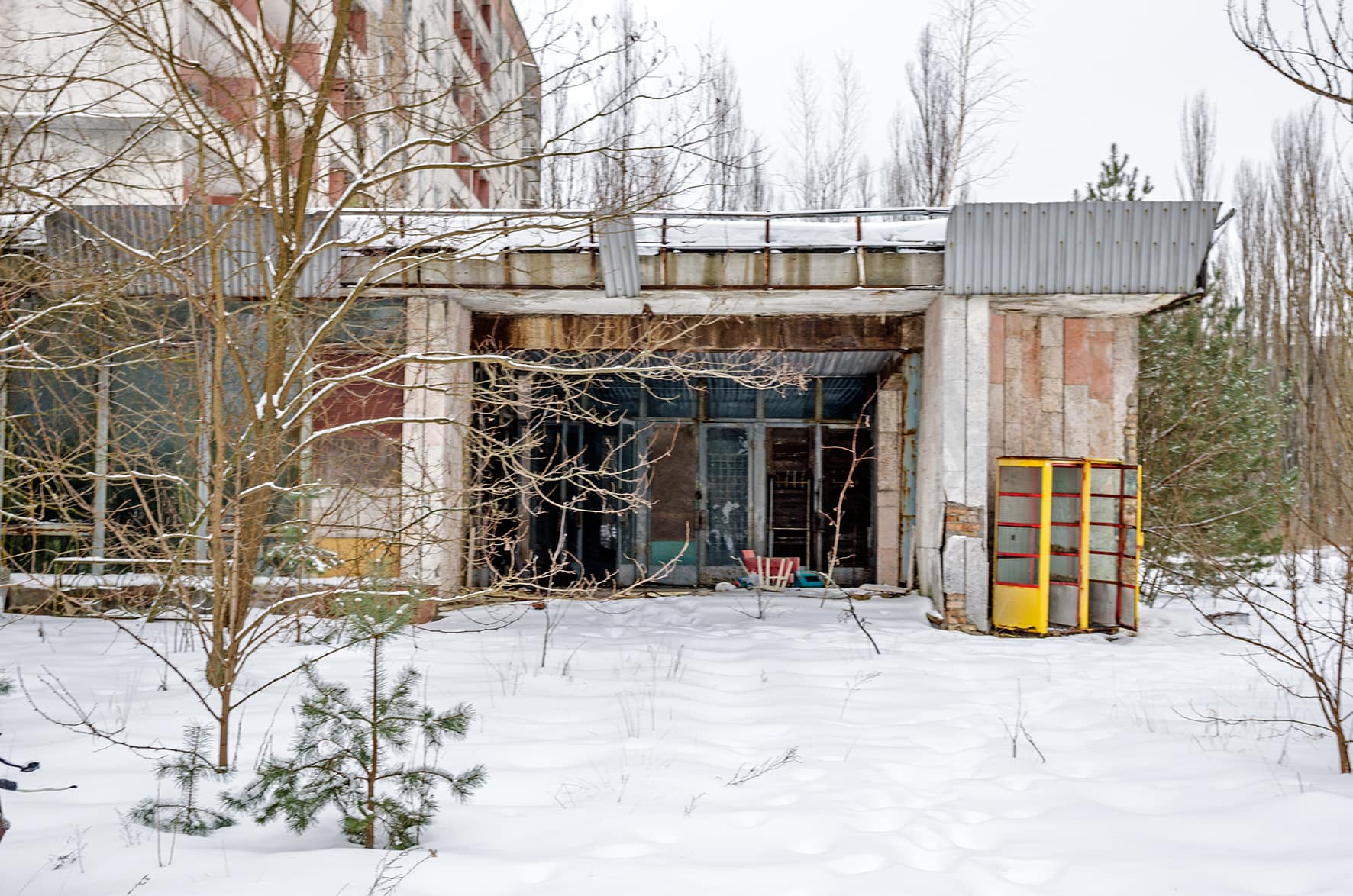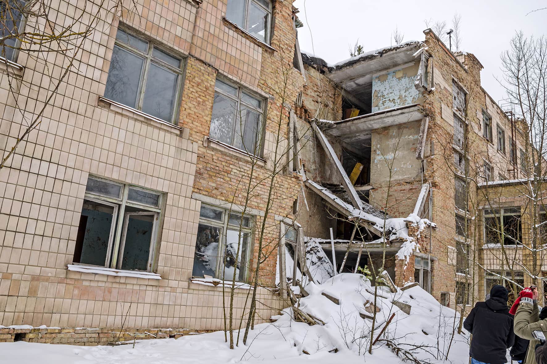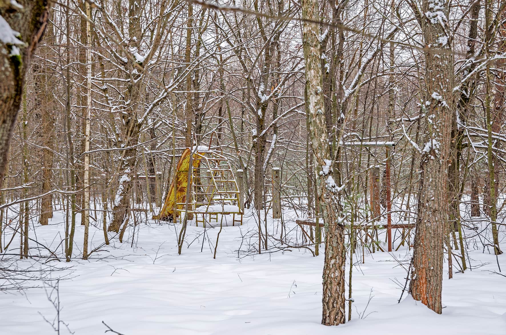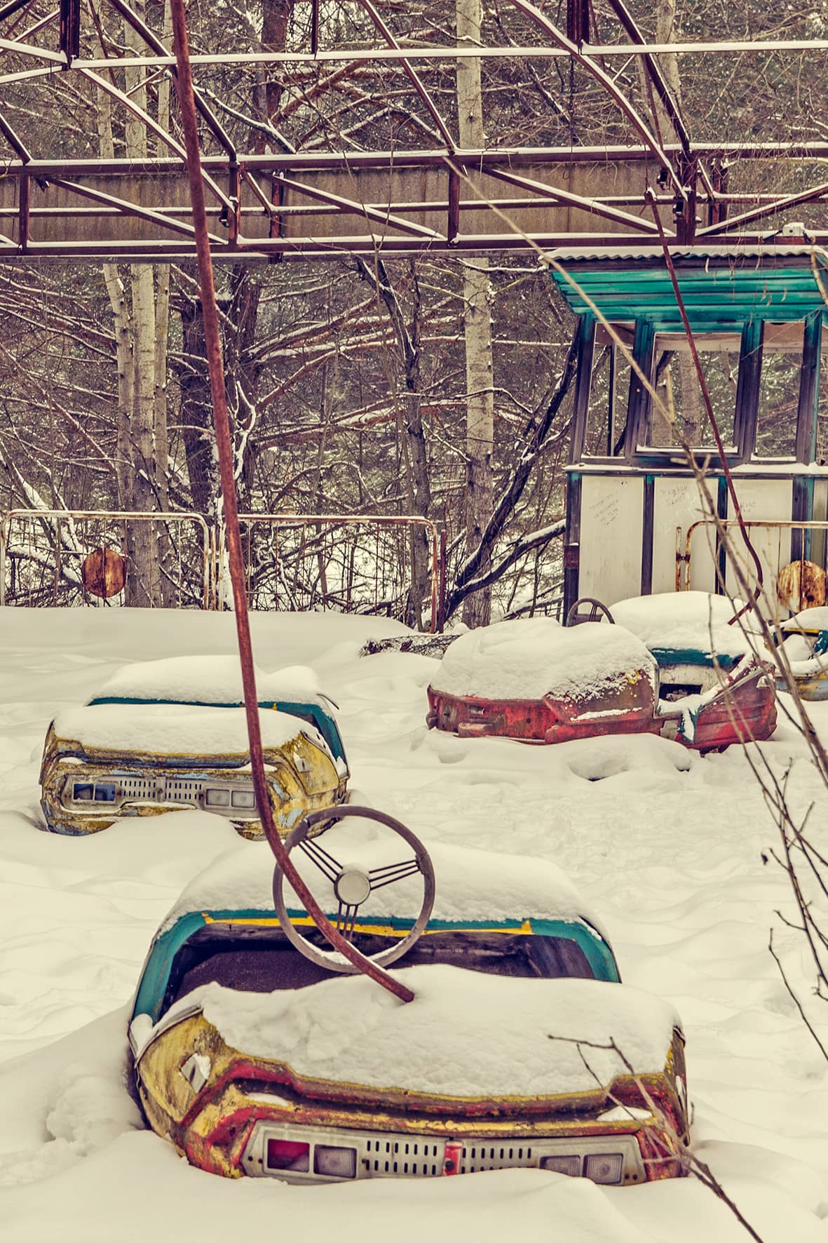 Podjeżdżamy pod wartownię. Pracownik sprawdza papiery i podnosi szlaban. Wjeżdżamy do miasta widma lub miasta duchów, jak je nazywają. W śniegu po kostki drogę wyznaczają ślady opon. Wjeżdżamy na główny plac Prypeci a później kilkanaście minut jeździmy po ‘ulicach’ miasta. To już nie miasto, to natura zaadoptowała ten teren. Tak jakby betonowe bloki wkomponowano w las. Raz po raz, Przewodnik opowiada nam, co mijamy.