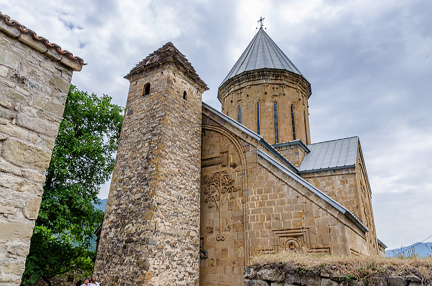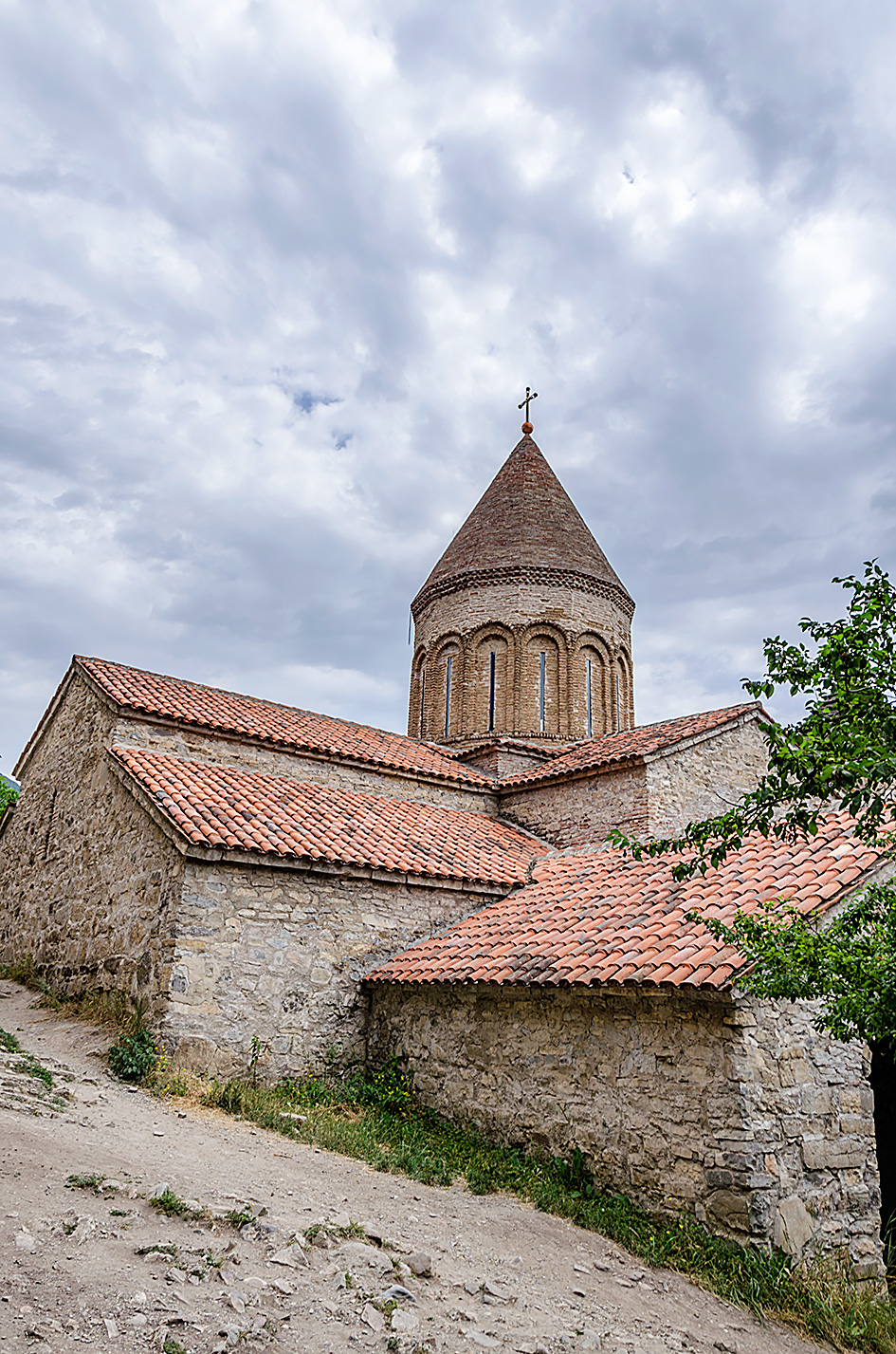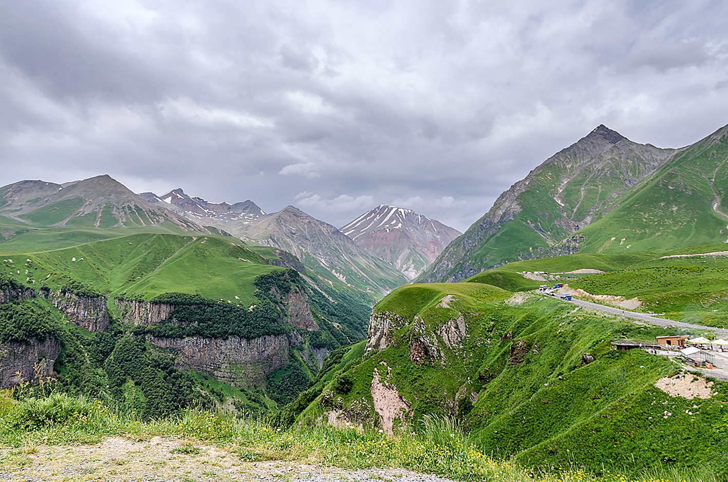 Cerkiew Cminda Sameba pod wezwaniem Trójcy Świętej, znajduje się na wysokości 2170 m n.p.m. Zbudowany wśród gór Kaukazu w XIV w. Pod klasztorem widoki zapierają dech w piersiach. Widać Kazbegi położone w dolinie. Przejaśniło się na chwilę.