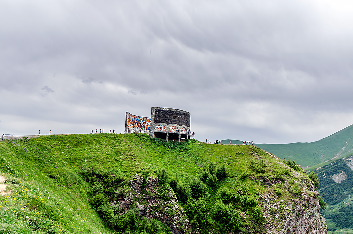 Najbardziej dziwaczny pomnik, jaki widziałam 🙂 Okrągła, betonowa platforma widokowa, w środku niczego, za to z przepięknym widokiem na Dolinę Diabła i góry Kaukazu. Wewnętrzną stronę ściany pokrywa kafelkowy mural, przedstawiający obrazy z historii obu narodów.